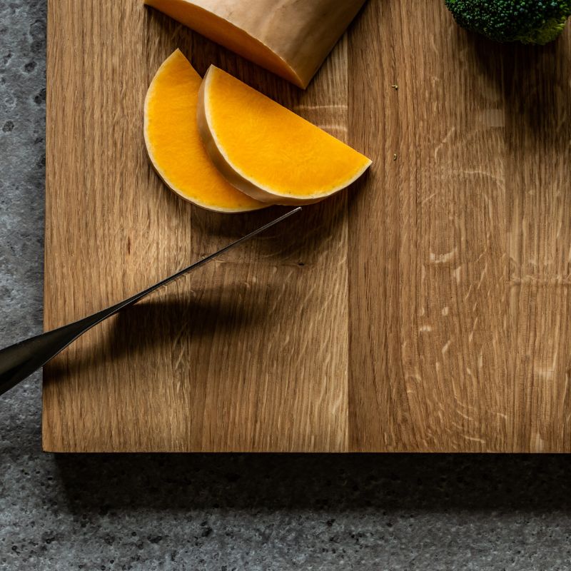 Skærebræt på 40 cm x 25,5 cm x 2 cm i massiv egetræ. Det flotte skærebræt har et smart håndtag i det ene hjørne, så man nemt kan flytte rundt på det. Skærebrættet kan benyttes både til brød, grøntsager, fisk og kød.