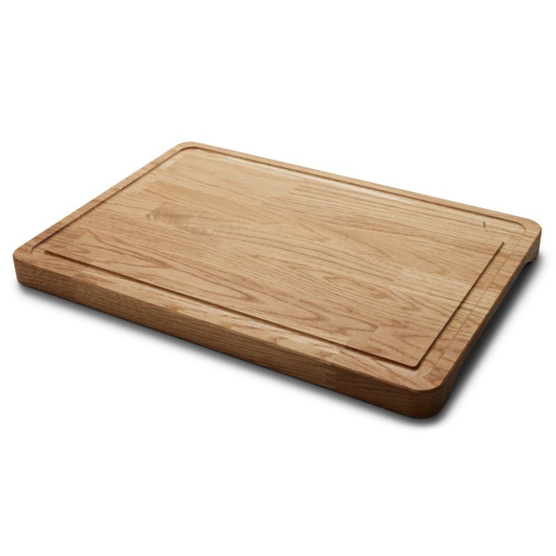 Skærebræt i egetræ på 43 x 30 x 3 cm med en bred saftrille og afrundede hjørner. Der er integrerede greb i enderne. Perfekt til udskæring af bøffer, steg, grøntsager, brød m.m. Skærebrættet er udført i olieret egetræ af høj kvalitet og er produceret i Danmark af Denwood.
